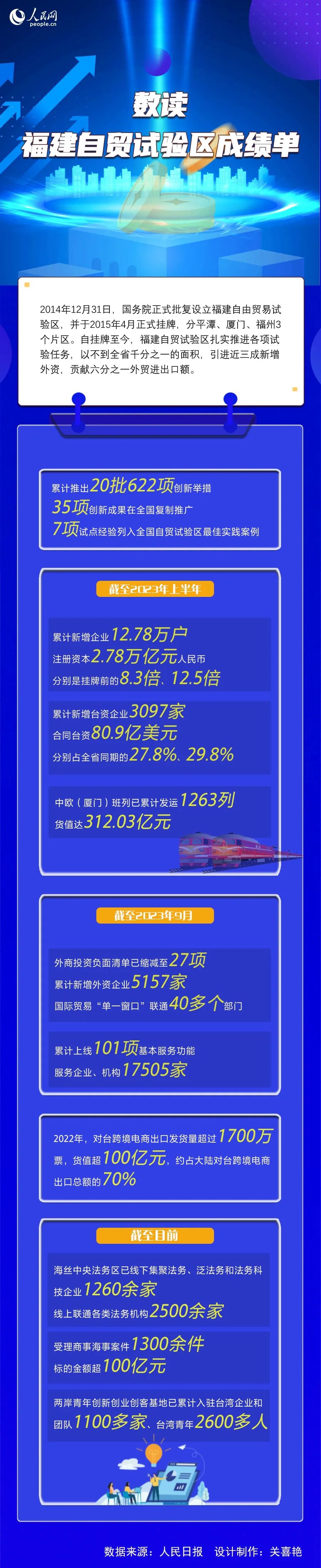 2014年12月31日,国务院正式批复设立福建自由贸易试验区,并于2015年4月正式挂牌,分平潭、厦门、福州3个片区,截至目前已累计推出20批622项创新举措,35项创新成果在全国复制推广,7项试点经验列入全国自贸试验区最佳实践案例……让我们一图了解福建自贸试验区近年的成绩单。