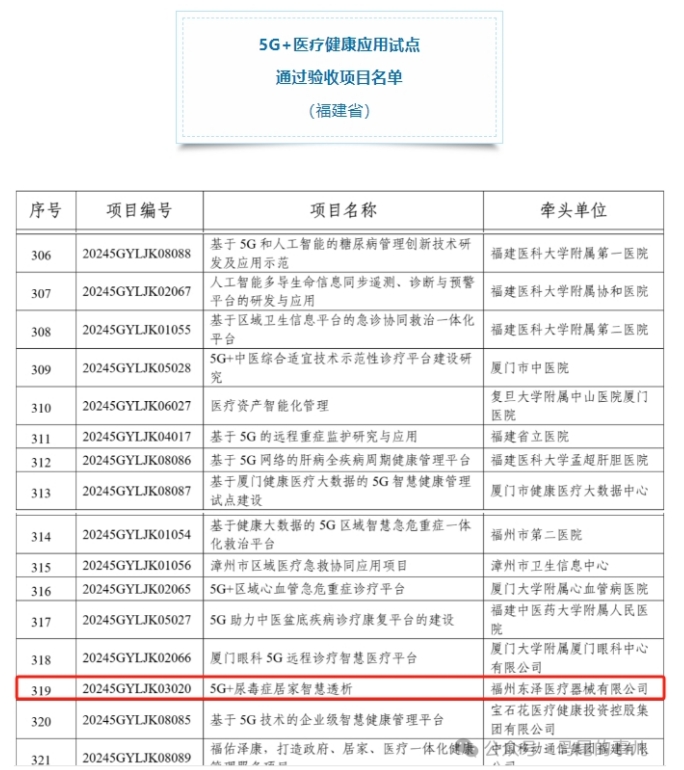 “5G+尿毒症居家智慧透析”项目于2021年由马尾企业福州东泽医疗器械有限公司牵头,华为科技、华西医院等单位共同完成,该项目是通过5G和智慧医疗技术,为尿毒症患者提供便捷、安全的居家透析服务,提升生活质量并优化医疗资源。